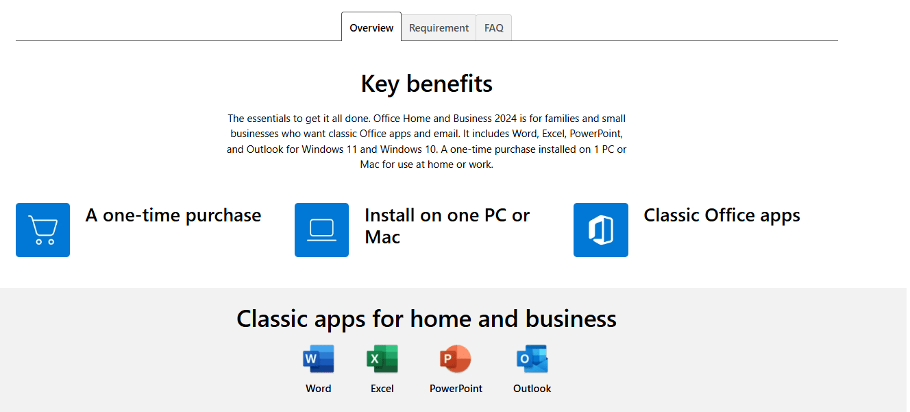 Office 2024 is sold as a one-time purchase, which means you pay a single, up-front cost to get Office apps for one computer. One-time purchases are available for both PCs and Macs. However, there are no upgrade options, which means if you plan to upgrade to the next major release, you’ll have to buy it at full price.